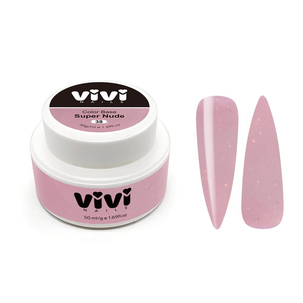Cover base Super nude 38 con purpurina 50ml delicada y fina. Base rígida para nivelación de textura media espesa, ideal para refuerzo de uñas naturales. Mantiene uñas impecables hasta 3-4 semanas sin desprendimientos ni grietas. El tono nude de muy buena pigmentación que cubre las imperfecciones de la uña natural. Sirve para las uñas normales, débiles o frágiles. Tiene bajo acidez Ph 6,5. Tiempo de secado rápido: 60 segundos en lámpara LED de 48W.