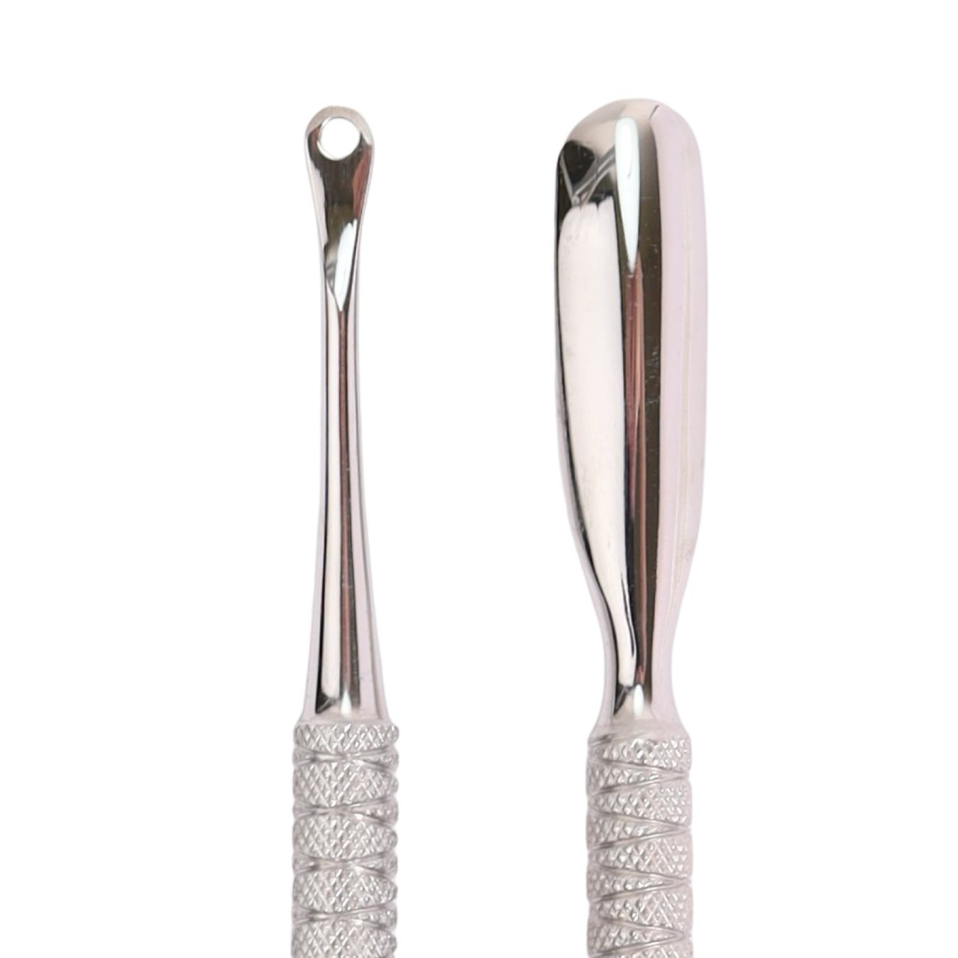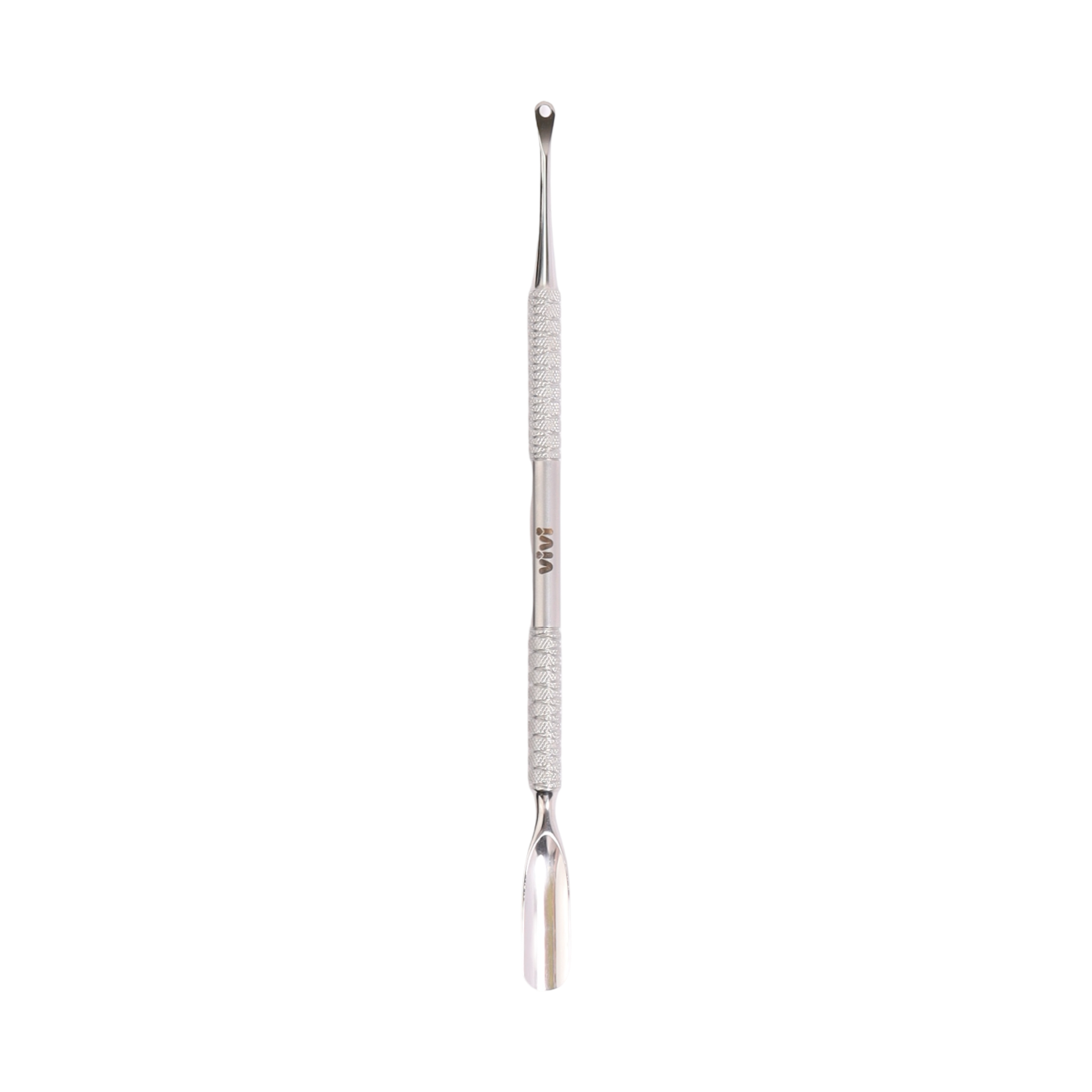Función 2 en 1: un extremo tipo pusher para levantar y empujar cutículas, y un extremo en forma de aro para eliminar el pterigión.