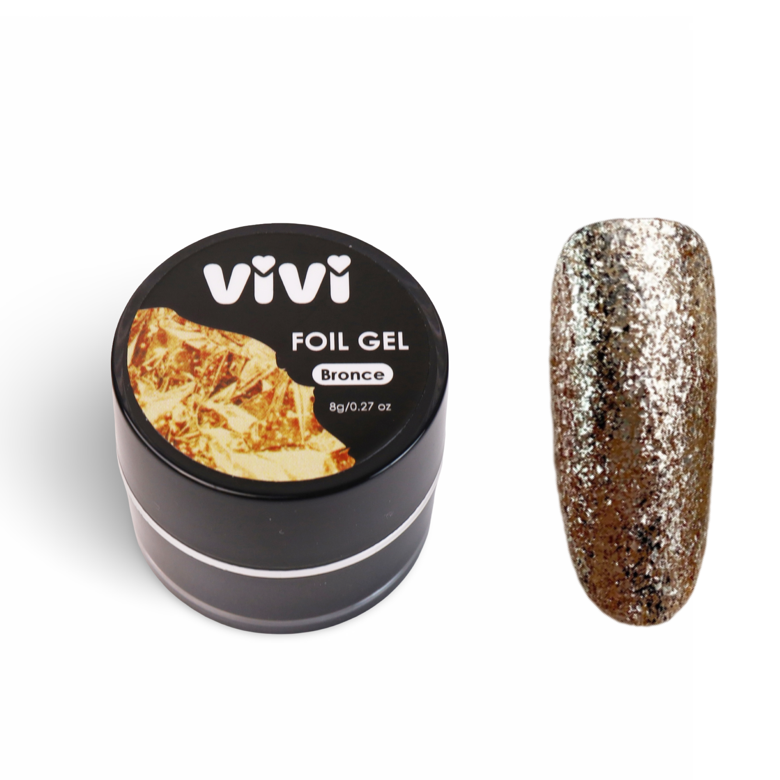 Foil Gel liquido Bronce 8g un gel para decoración de uñas de consistencia espesa y alta pigmentación, con un espectacular brillo metálico con copos de foil. Ideal para líneas finas, ornamentos, degradado, manicura francesa y nail art. Tiene capa pegajosa y se polimeriza en 60 segundos en lámpara LED.