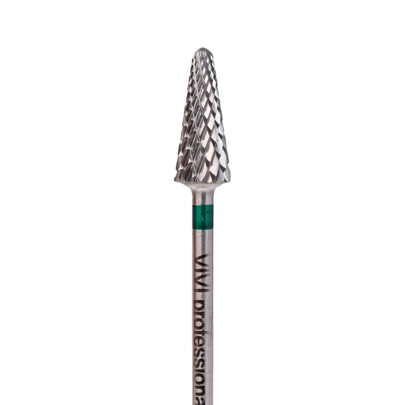 Fresa de carburo Cono verde 41160 con punta semiesférica y corte cruzado grueso verde. Ideal para retirar geles duros,,  Polygel, AcrylGel y acrílico, corregir uñas esculpidas y trabajar uñas engrosadas. Compatible con tornos de 2,35 mm, apta para desinfección y esterilización. Alta durabilidad y máxima precisión profesional.
