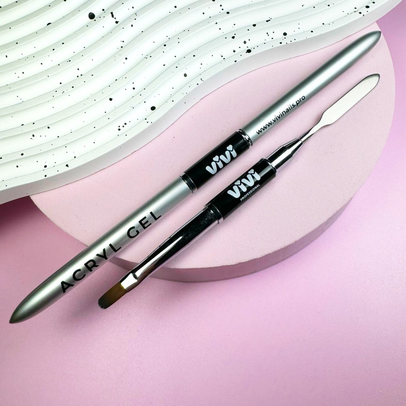 El Pincel Acryl gel con espatula 2 en 1 de Vivi Nails es la solución perfecta para trabajar con este tipo de materiales. Gracias a su diseño doble, reúne en un solo instrumento una espátula metálica para recoger y colocar el producto y un pincel fino y preciso de 10 x 4 mm para distribuirlo y moldearlo sobre la uña. Una herramienta profesional, versátil y cómoda que ahorra tiempo, mejora la precisión y permite resultados impecables en cada servicio.