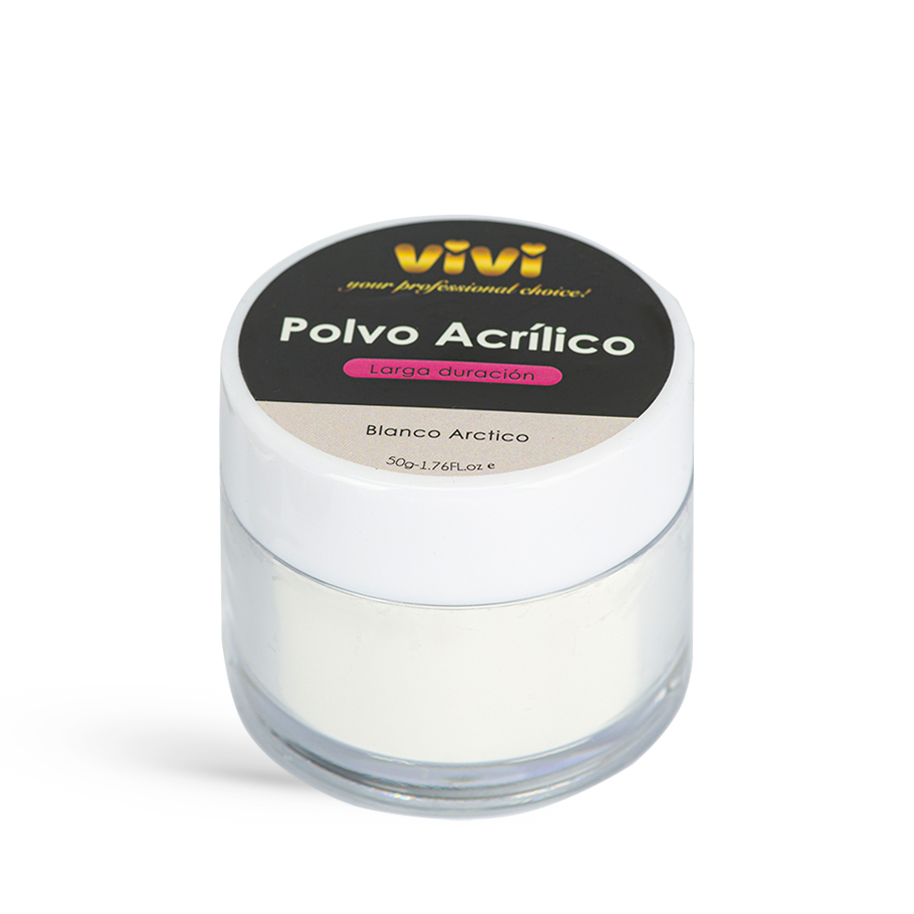 Polvo Acrílico Vivi 50g Blanco — textura sedosa, cobertura uniforme y máxima adherencia. Ideal para uñas elegantes y duraderas. Tamaño 50g.