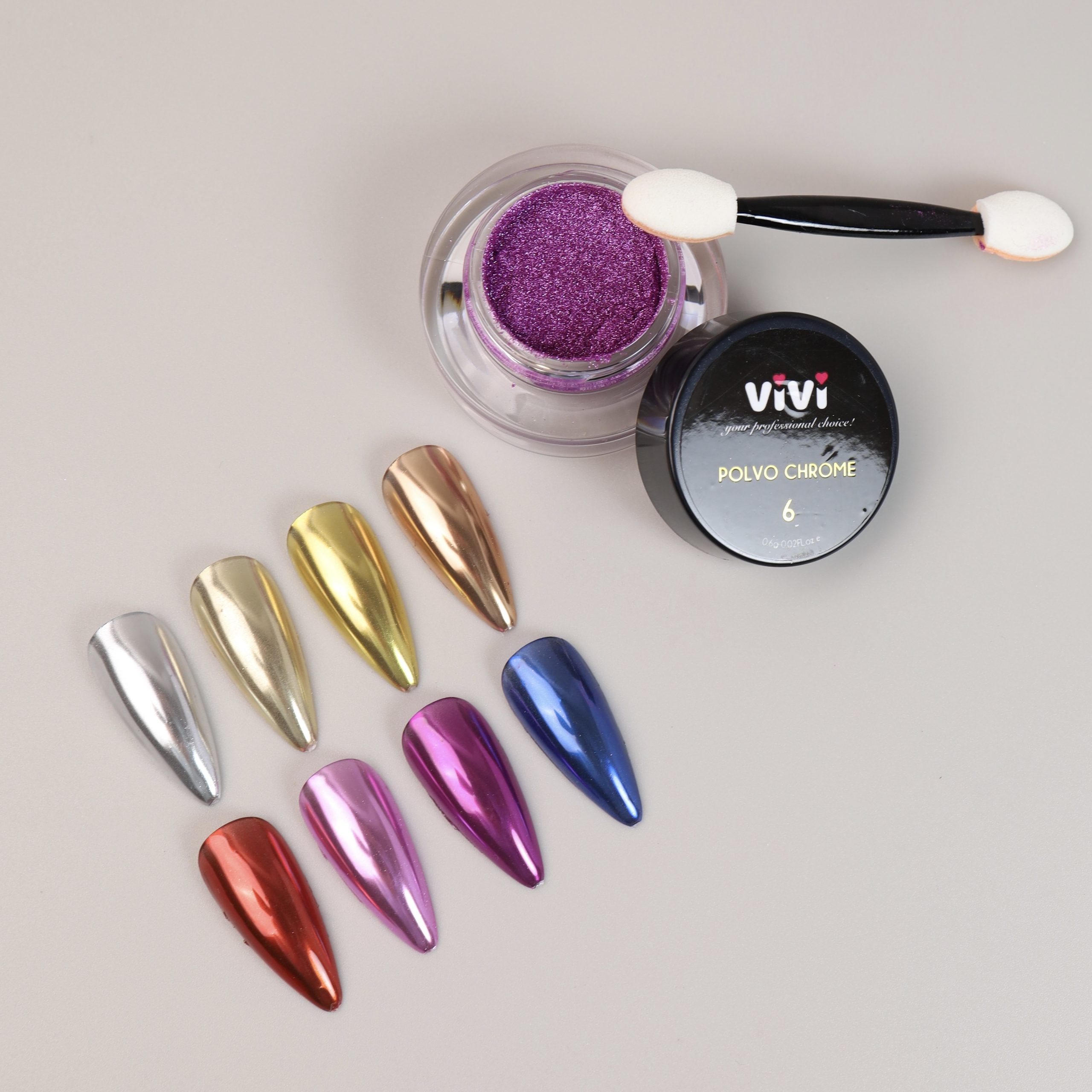 Polvo con efecto metálico CHROME 3 contiene especial aplicador. Ideal para crear los diseños creativos en nail art. Se aplica facilmente. Se cubre con Top coat. Tamaño 0,6g